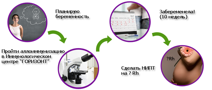 2. При наступлении долгожданной беременности сдать неинвазивный тест на определение резус-фактора плода по крови матери (НИПТ на ?Rh) с 10ти недель беременности в Иммунологическом центре «ГОРИЗОНТ»